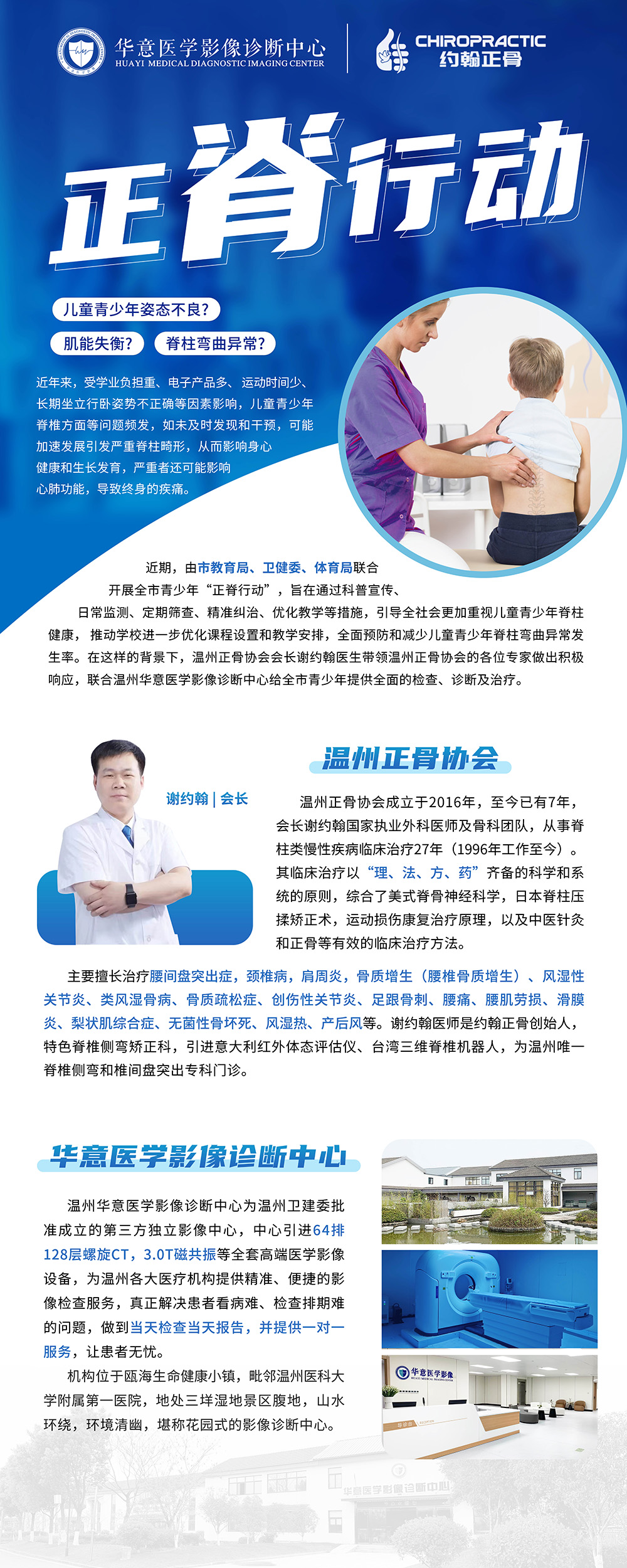 近些年来,受生活方式改变、学业负担重、电子产品多、 运动时间少、长期坐立行卧姿势不正确等各方面因素影响,儿童 青少年姿态不良、肌能失衡、脊柱弯曲异常等问题多发频发。如未及时发现和干预,可能加速 发展引发严重脊柱畸形,从而影响身心健康和生长发育,严重者 还可能影响心肺功能,带来终身的疾痛。因此近期,由温州市教育局,温州市卫健委,温州市体育局联合开展全市青少年“正脊行动”旨在通过科普宣传、日常监测、定期筛查、精准纠 治、优化教学等措施,引导全社会更加重视儿童青少年脊柱健康, 推动学校进一步优化课程设置和教学安排,全面预防和减少儿童 青少年脊柱弯曲异常发生率。在这样的背景下,温州正骨协会会长谢约翰医生带领温州正骨协会的各位专家做出积极响应,联合温州华意医学影像诊断中心给全市青少年提供全面的检查、诊断及治疗。